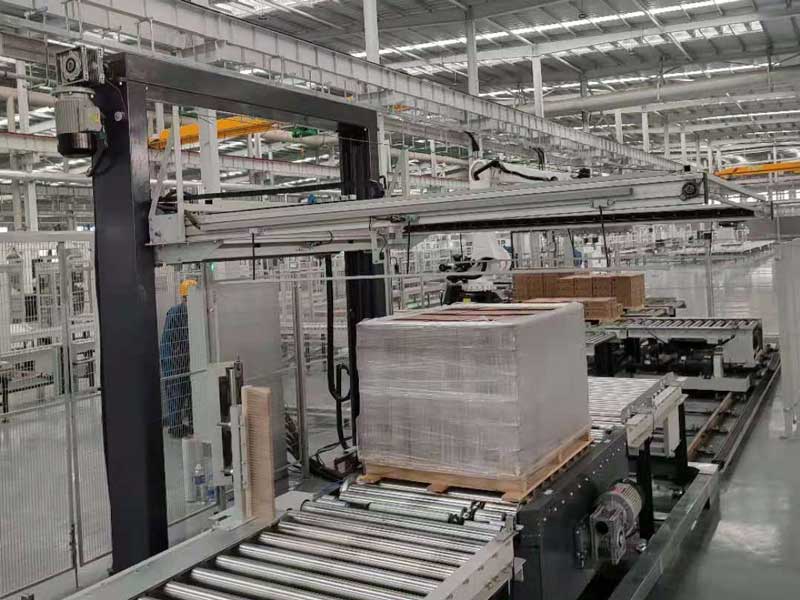 (4)設備裝有自動上膜、斷膜裝置,實現全自動上斷膜工作。膜架出膜係統單獨采用預拉伸電機,使市場標準機用預拉伸纏繞膜可拉長2.5-2.8倍,可有利的節省耗材成本。